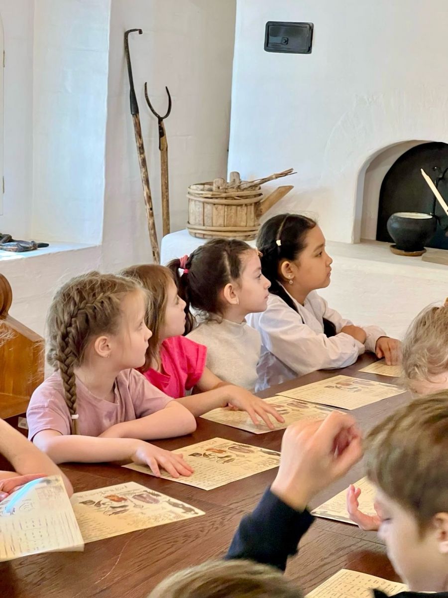 Ребятам рассказали о древнем государевом селе Коломенском. Познакомили с историей и бытом средневековья, в том числе погрузили в атмосферу древнерусской школы.