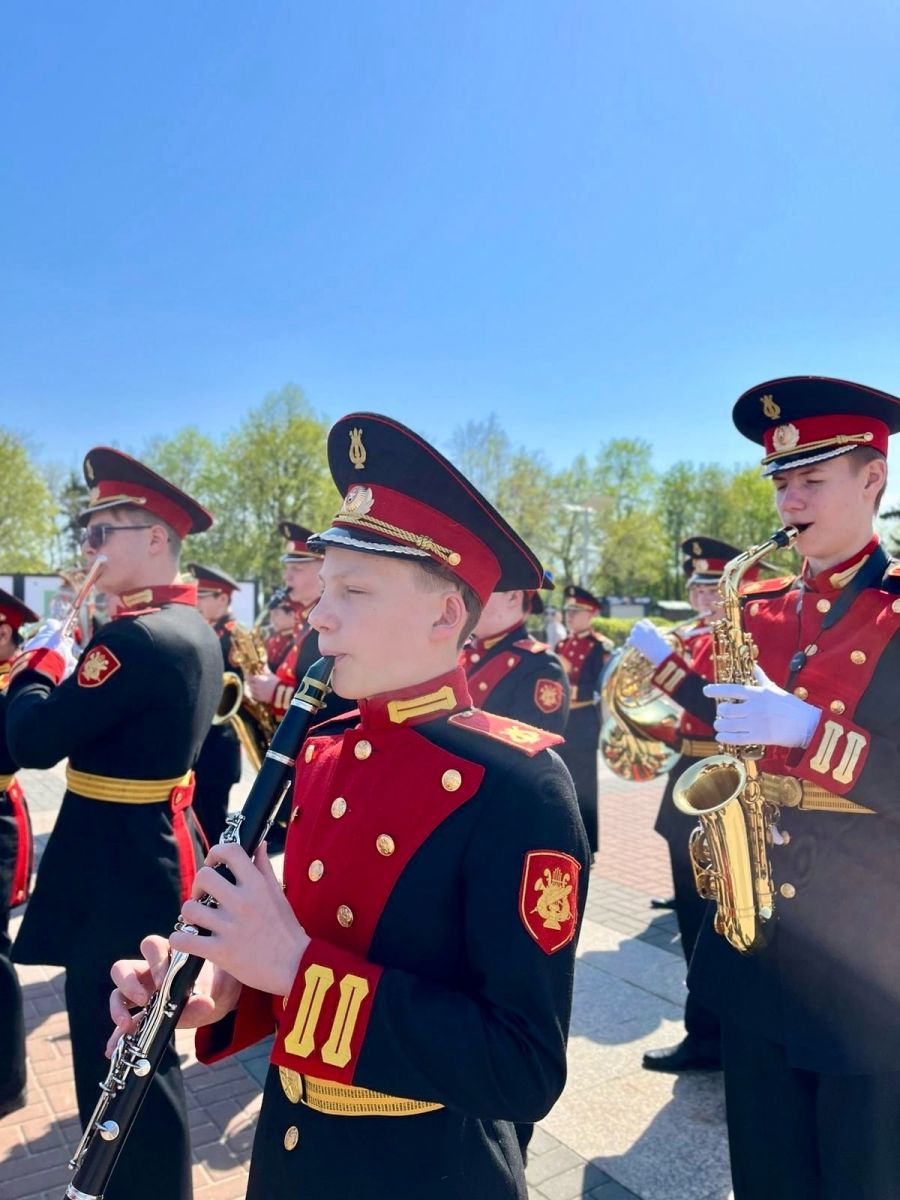 Школьный духовой оркестр мальчиков под управлением Далера Шарипова и Алексея Беляева выступил в Ульяновске на открытии выставки военного плаката «Уроки истории», приуроченной к празднованию 80-летия Победы.