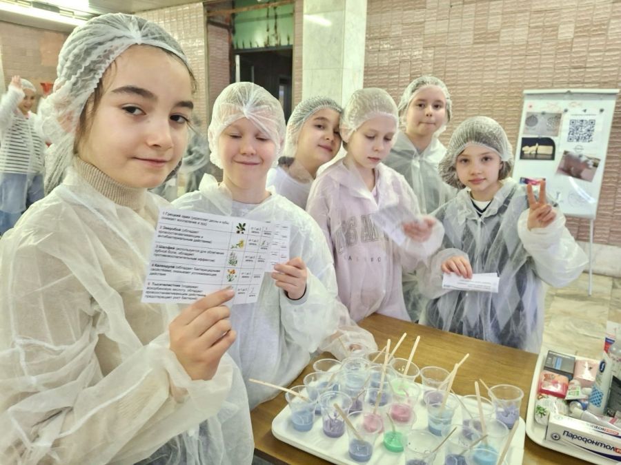 На мастер-классе ребята попробовали себя в роли технологов-изготовителей. Каждый ученик разработал свой уникальный состав зубной пасты и создал для нее особенный цвет.
